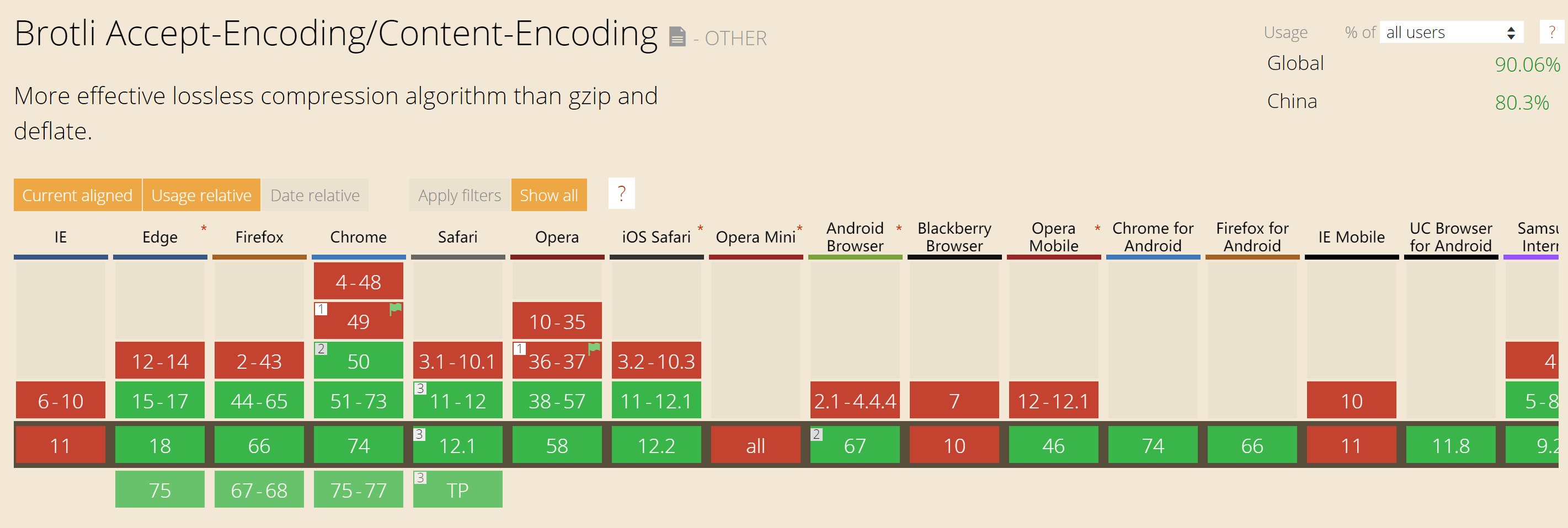 另外,除了 IE 和 Opera Mini 之外,几乎所有的主流浏览器都已支持 Brotli 算法,具体支持请看见下图: