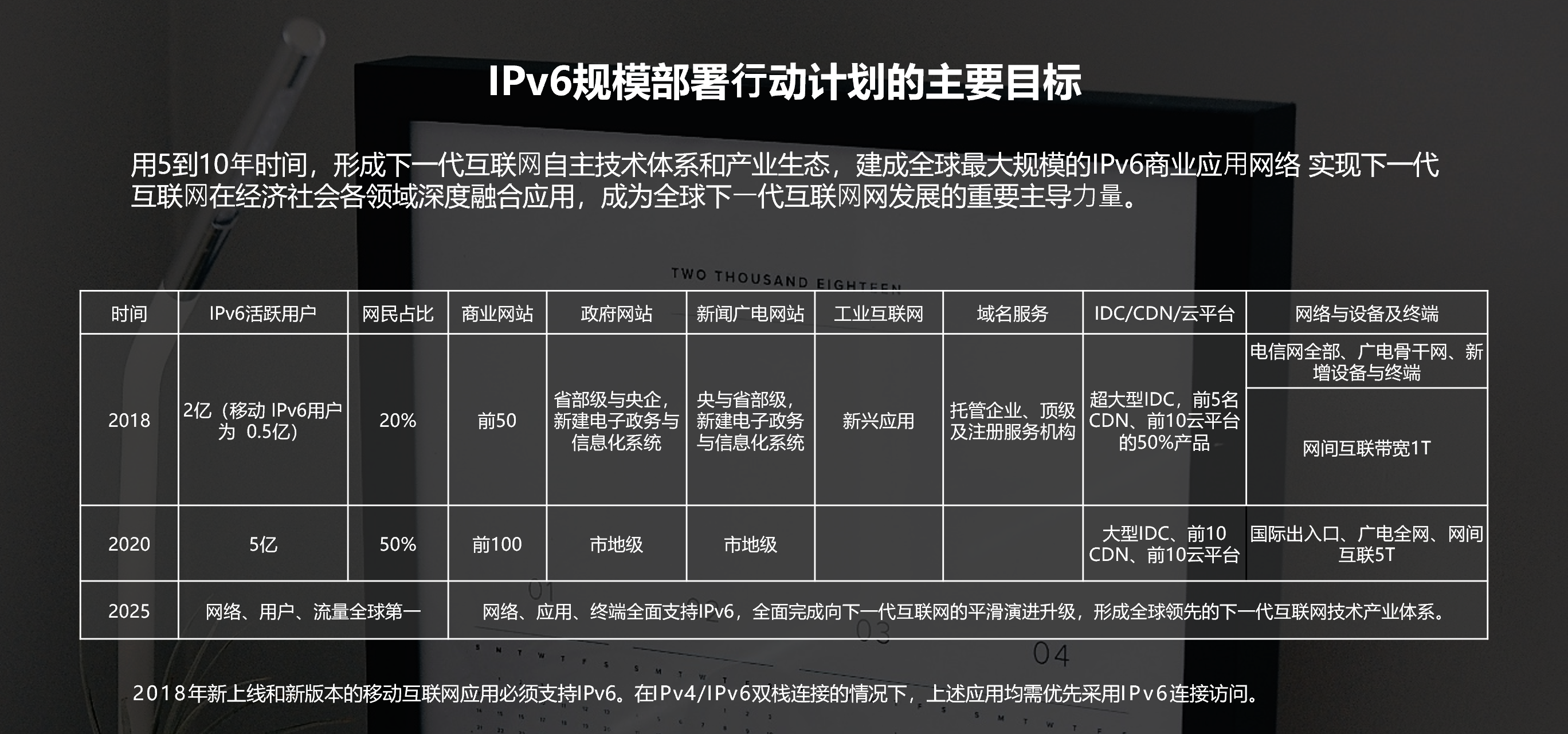 中国是世界互联网大国,但是近年来,随着中国云计算、物联网、工业互联网和人工智能等产业的迅速布局,日益枯竭的 IPv4 地址资源已严重阻碍了中国互联网产业的蓬勃发展,但在早期中国一直没有普及 IPv6,而是继续让 IPv4 缝缝补补继续用了几年,因为 IPv6 的改造是一个涉及 “端、管、云” 三方面的系统性工程,但自2017年底,中办国办印发《推进互联网协议第六版(IPv6)规模部署行动计划》以来,IPv6 的普及开始进入了快车道。其中指出加快推进基于 IPv6 的下一代互联网规模部署,计划指出到 2018 年末国内 IPv6 活跃用户数要达到2亿,2020年末达到5亿,2025年末中国 IPv6 规模要达到世界第一。