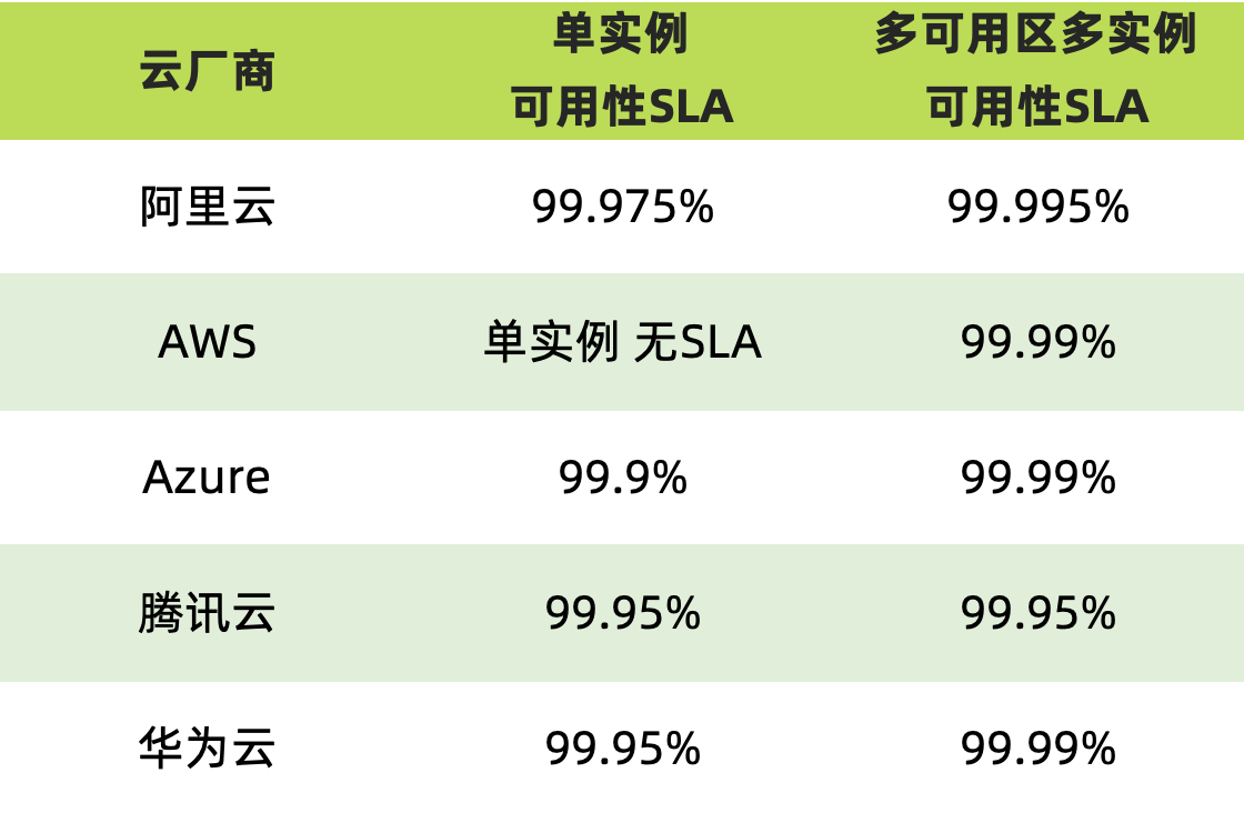 下面两张图片是各大主流云计算厂商间的SLA对比:(参考发文日的厂商SLA文档,如有错误请指出)