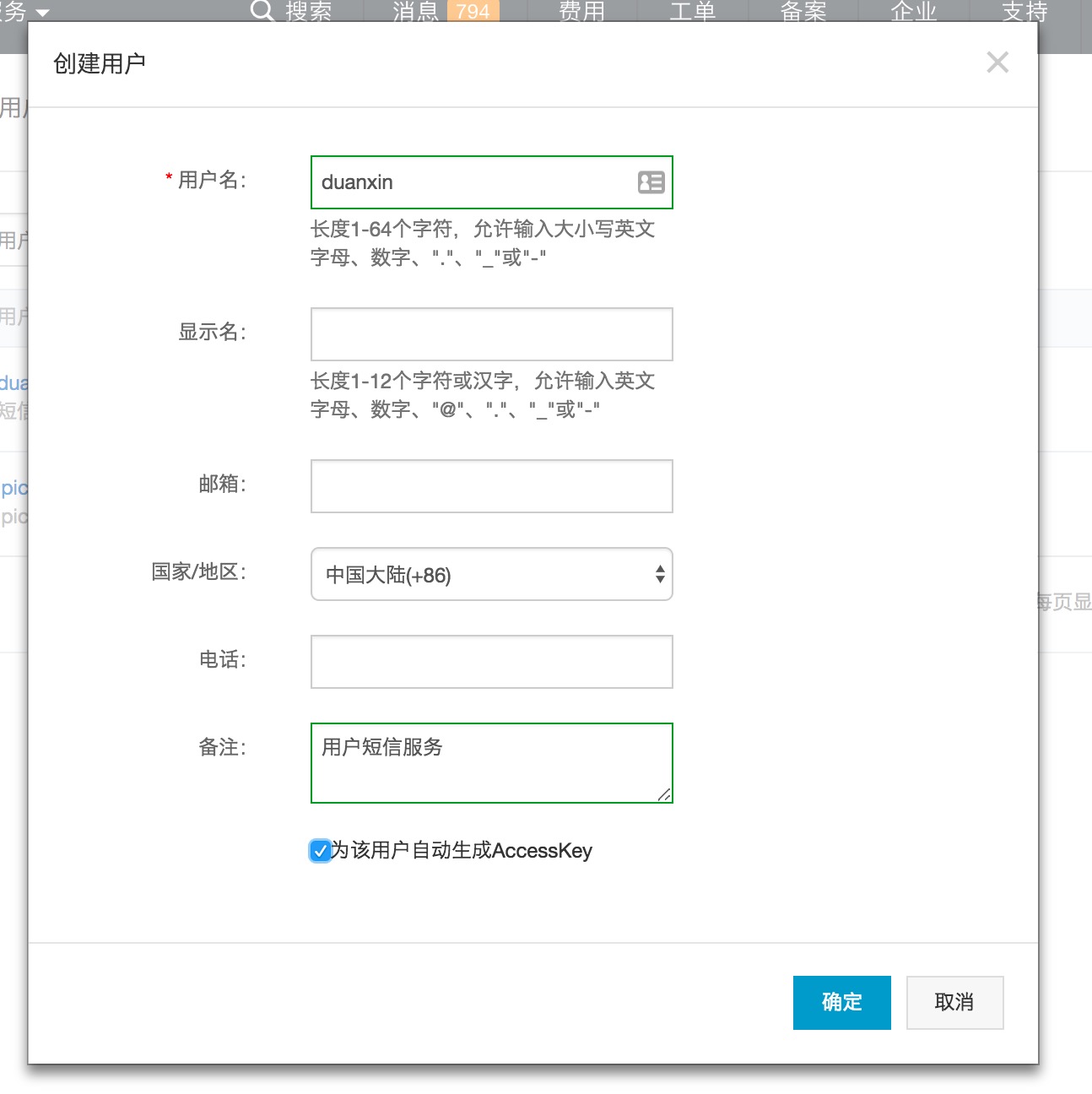四、 在开通 访问控制 服务,建立一个专门用于短信服务的子账户,一定要把 AccessKey 的点一下。